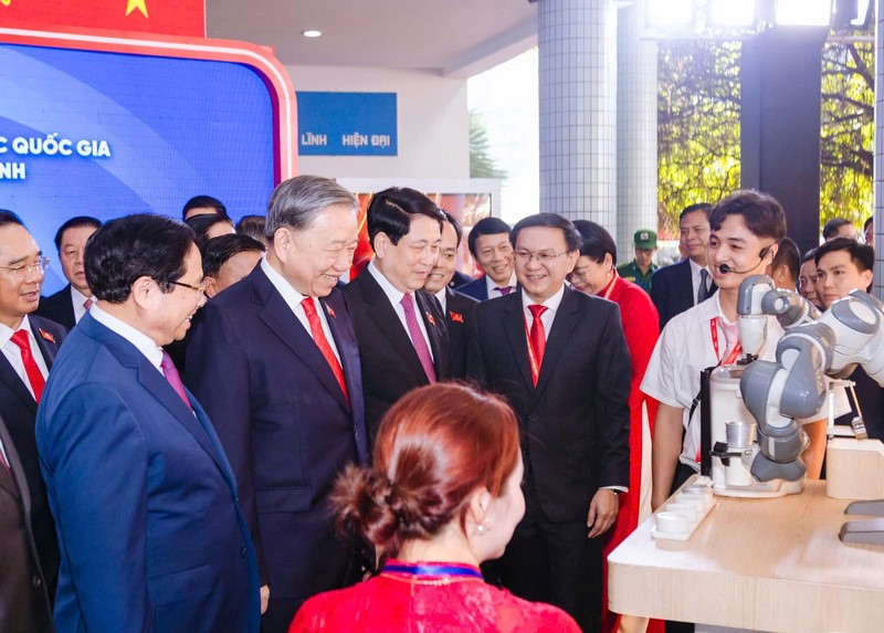 Tổng Bí thư Tô Lâm cùng các lãnh đạo, nguyên lãnh đạo Đảng, Nhà nước tham quan không gian triển lãm thiết bị công nghệ chiến lược tại Đại hội đại biểu Đảng bộ TP. Hồ Chí Minh. Trần Duy Khanh - sinh viên Khoa Công nghệ Điện IUH (áo trắng bên phải) vinh dự được trình bày sản phẩm công nghệ. Ảnh: IUH.